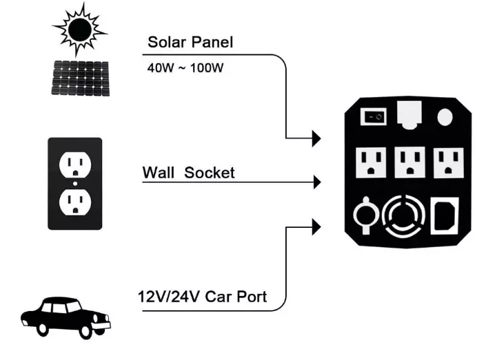 Kaip AC/DC 12 V / 220 V / 5 V išvestis, tinka įvairiems įrenginiams, pavyzdžiui, mobiliesiems telefonams, planšetiniams kompiuteriams, nešiojamiesiems kompiuteriams, mažiems spausdintuvams, įvairių tipų lempoms ir žibintams, mažiems žuvų rezervuarų šildytuvams, fotografijos įrangai,