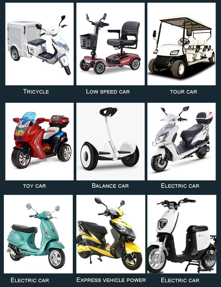 Ličio baterijų paketas plačiai naudojamas komerciniuose autobusuose ir autobusuose, elektriniuose automobiliuose, elektriniuose autobusuose, golfo vežimėliuose / elektriniuose dviračiuose, motoroleriuose, nameliuose ant ratų, jūrų pėstininkuose, autobusuose, nameliuose ant ratų, neįgaliųjų vežimėliuose, elektroniniuose sunkvežimiuose, elektroninėse šlavimo mašinose, grindų valytuvuose, elektroninėse vaikštynėse, mobilumo motoroleriuose, elektriniuose motocikluose, triračiuose, elektriniuose neįgaliųjų vežimėliuose, vaikų važiuojamuosiuose automobiliuose, „pasidaryk pats“ elektriniuose įrankiuose ir kt.